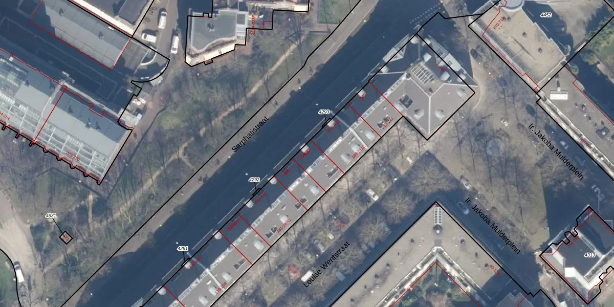 Het perceel waarop Sarphatistraat 654 staat heeft een oppervlakte van 4914 m². Dit is een zeer groot perceel. De perceeloppervlakte wordt geregistreerd door het Kadaster. Gedetailleerde informatie over de maten van dit perceel kunt u vinden in het rapport Kadastrale kaart met maatvoering van Sarphatistraat 654.
