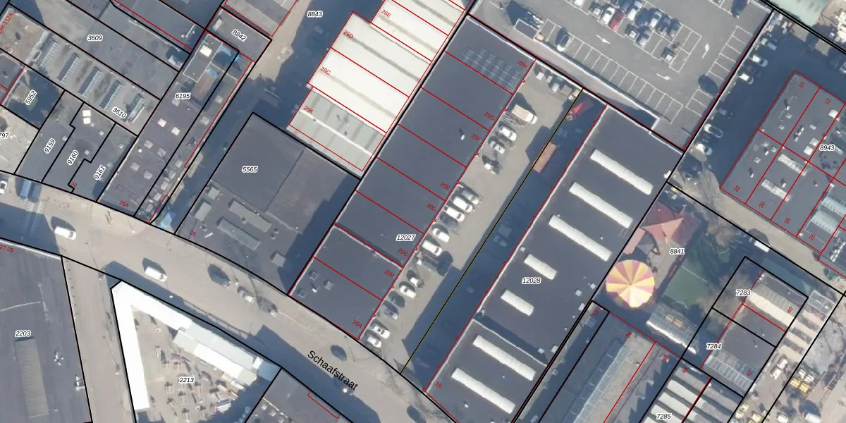 Het perceel waarop Schaafstraat 20-D staat heeft een oppervlakte van 2602 m². Dit is een zeer groot perceel. De perceeloppervlakte wordt geregistreerd door het Kadaster. Gedetailleerde informatie over de maten van dit perceel kunt u vinden in het rapport Kadastrale kaart met maatvoering van Schaafstraat 20-D.