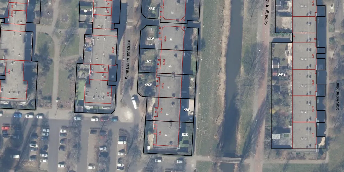Schaarsbergenstraat 42 is gelegen op kadastraal perceel WPK02L2247. Deze kadastrale aanduiding is uniek en wordt gebruikt door het Kadaster om eigendomsrechten en andere zakelijke rechten vast te leggen. Het perceel maakt onderdeel uit van de kadastrale gemeente Weesperkarspel.