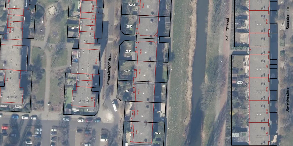 Schaarsbergenstraat 54 is gelegen op kadastraal perceel WPK02L2246. Deze kadastrale aanduiding is uniek en wordt gebruikt door het Kadaster om eigendomsrechten en andere zakelijke rechten vast te leggen. Het perceel maakt onderdeel uit van de kadastrale gemeente Weesperkarspel.
