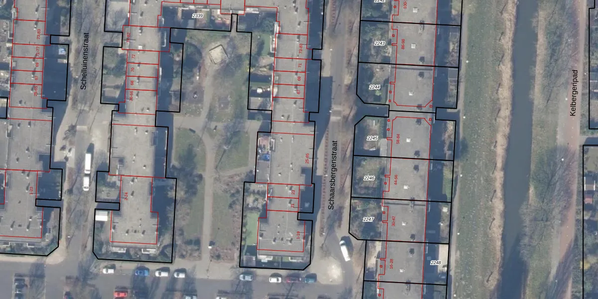 Het perceel waarop Schaarsbergenstraat 55 staat heeft een oppervlakte van 4984 m². Dit is een zeer groot perceel. De perceeloppervlakte wordt geregistreerd door het Kadaster. Gedetailleerde informatie over de maten van dit perceel kunt u vinden in het rapport Kadastrale kaart met maatvoering van Schaarsbergenstraat 55.
