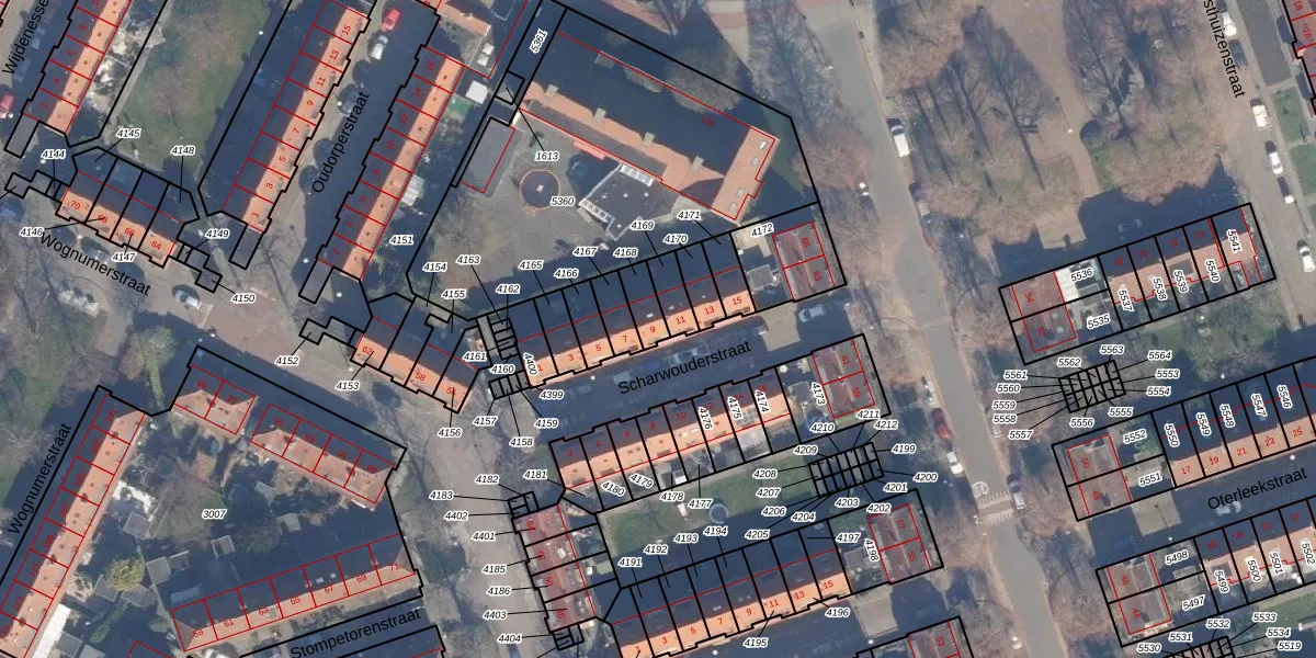 Gebruik de zoekbalk of klik op een perceel voor informatie over de adressen binnen dit perceel.