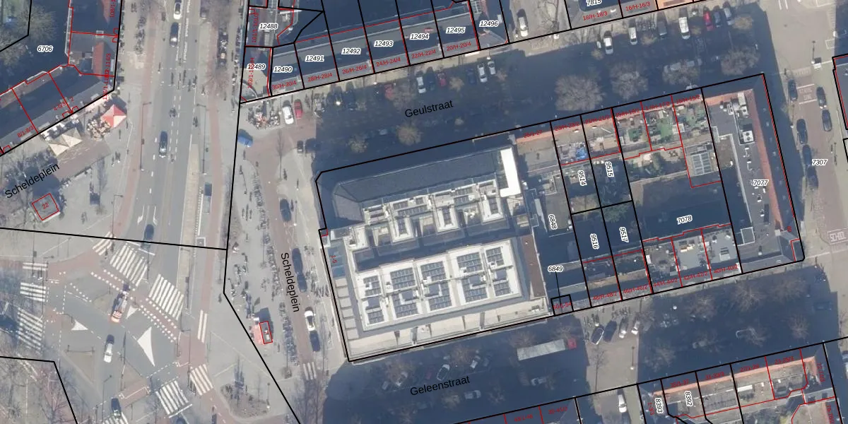 Het perceel waarop Scheldeplein 1-M staat heeft een oppervlakte van 2593 m². Dit is een zeer groot perceel. De perceeloppervlakte wordt geregistreerd door het Kadaster. Gedetailleerde informatie over de maten van dit perceel kunt u vinden in het rapport Kadastrale kaart met maatvoering van Scheldeplein 1-M.