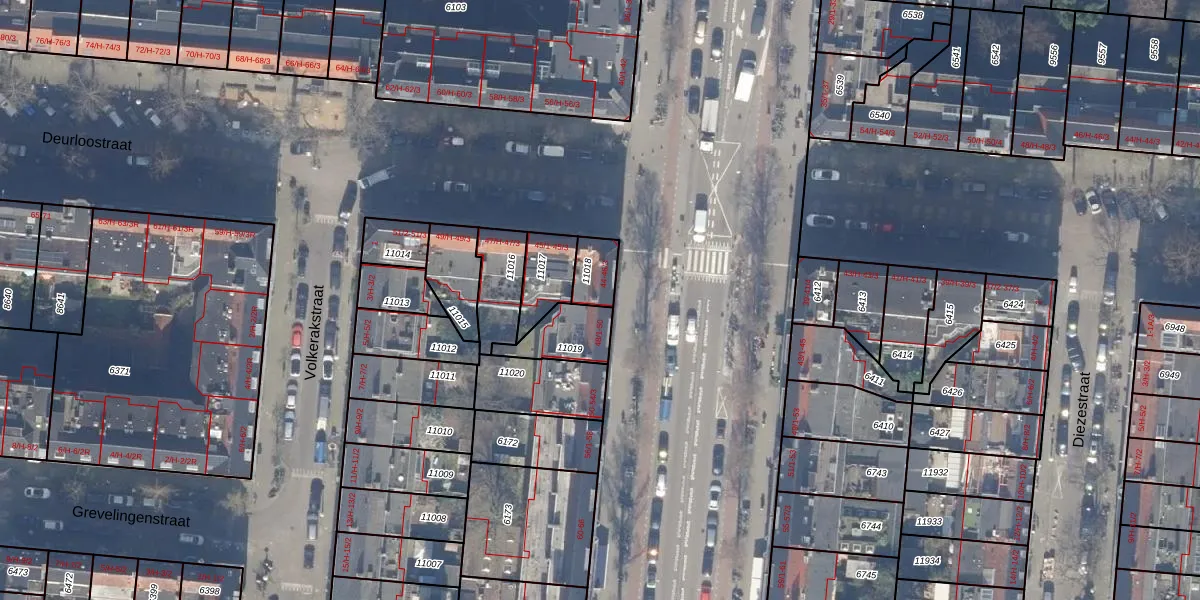 Het adres is gelegen op perceel 11018 in de sectie V en de kadastrale gemeente Amsterdam. De kadastrale aanduiding is aldus ASD18-V-11018. Het perceel is kleiner dan gemiddeld in Amsterdam. Het perceel is 76 m² groot, terwijl het gemiddelde ligt op 559,23 m². Het grootste perceel in de kadastrale gemeente is 12,5 ha. Het kleinste perceel heeft een oppervlakte van 0 m². Er zijn 4 adressen aanwezig op het perceel. De huidige grenzen van het perceel zijn digitaal in de Basisregistratie Kadaster (BRK) geregistreerd op 17-10-2006.