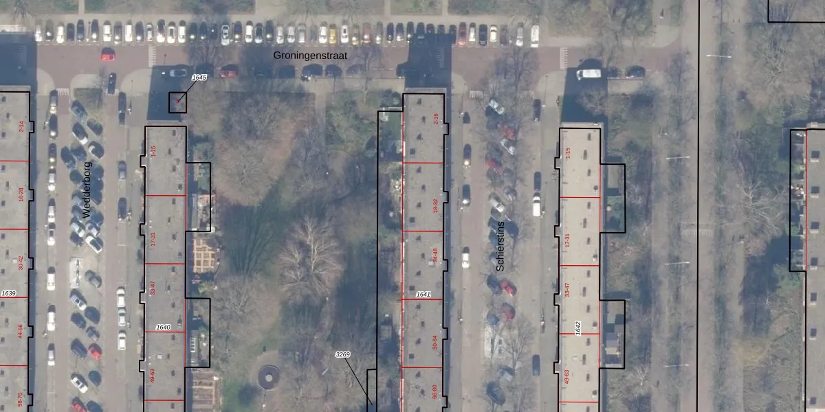 Het perceel waarop Schierstins 30 staat heeft een oppervlakte van 1322 m². Dit is een zeer groot perceel. De perceeloppervlakte wordt geregistreerd door het Kadaster. Gedetailleerde informatie over de maten van dit perceel kunt u vinden in het rapport Kadastrale kaart met maatvoering van Schierstins 30.