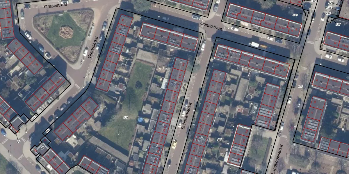 Schovenstraat 12 is gelegen op kadastraal perceel WTG02C421. Deze kadastrale aanduiding is uniek en wordt gebruikt door het Kadaster om eigendomsrechten en andere zakelijke rechten vast te leggen. Het perceel maakt onderdeel uit van de kadastrale gemeente Watergraafsmeer.