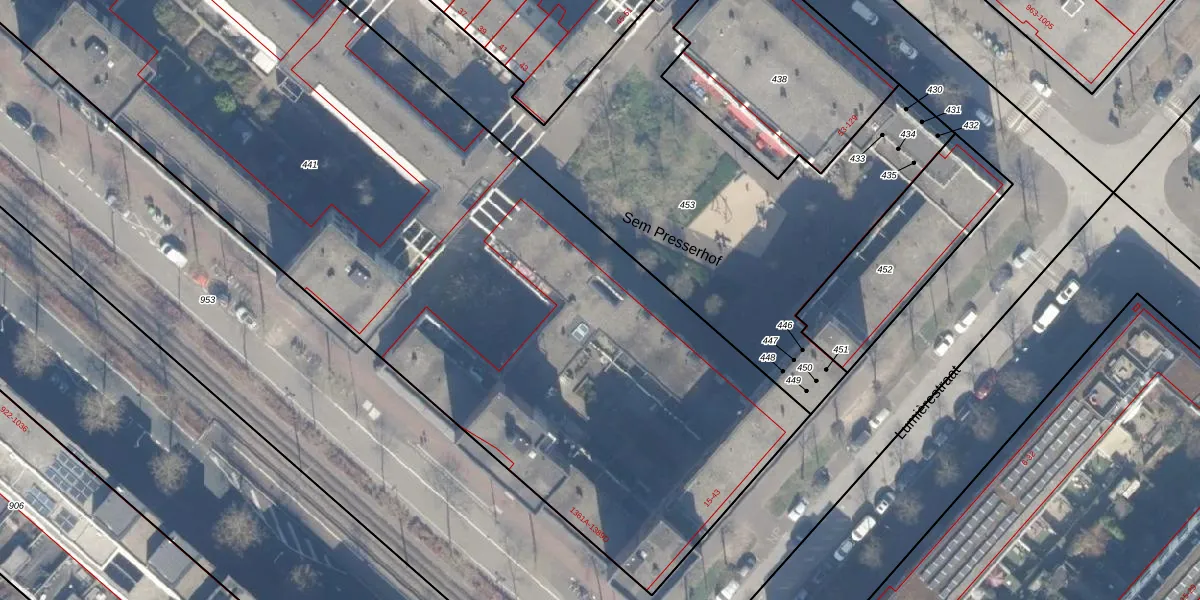 Sem Presserhof 100 is gelegen op kadastraal perceel ASD41AU441. Deze kadastrale aanduiding is uniek en wordt gebruikt door het Kadaster om eigendomsrechten en andere zakelijke rechten vast te leggen. Het perceel maakt onderdeel uit van de kadastrale gemeente Amsterdam.
