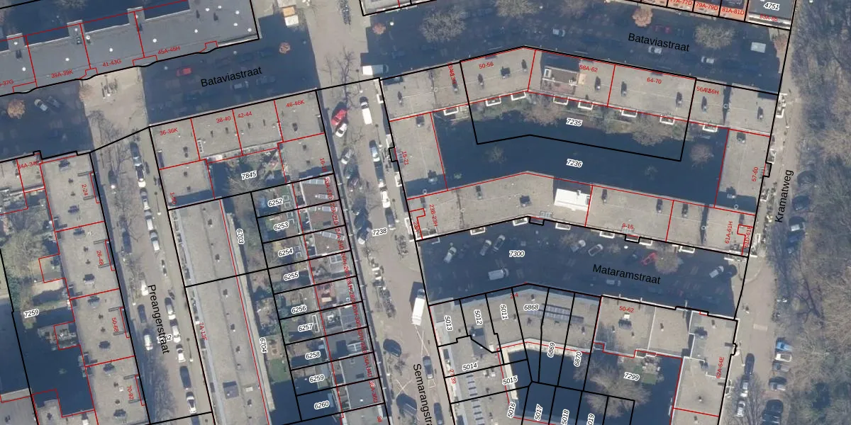 Het perceel waarop Semarangstraat 23-B staat heeft een oppervlakte van 2418 m². Dit is een zeer groot perceel. De perceeloppervlakte wordt geregistreerd door het Kadaster. Gedetailleerde informatie over de maten van dit perceel kunt u vinden in het rapport Kadastrale kaart met maatvoering van Semarangstraat 23-B.