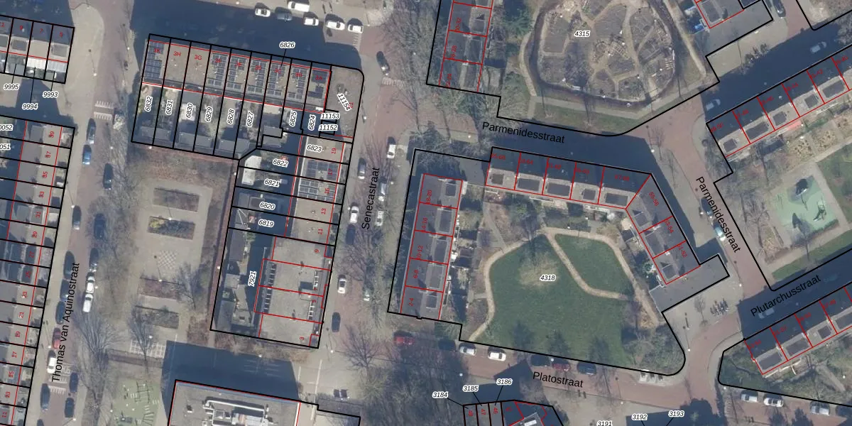 Het perceel waarop Senecastraat 16 staat heeft een oppervlakte van 2974 m². Dit is een zeer groot perceel. De perceeloppervlakte wordt geregistreerd door het Kadaster. Gedetailleerde informatie over de maten van dit perceel kunt u vinden in het rapport Kadastrale kaart met maatvoering van Senecastraat 16.