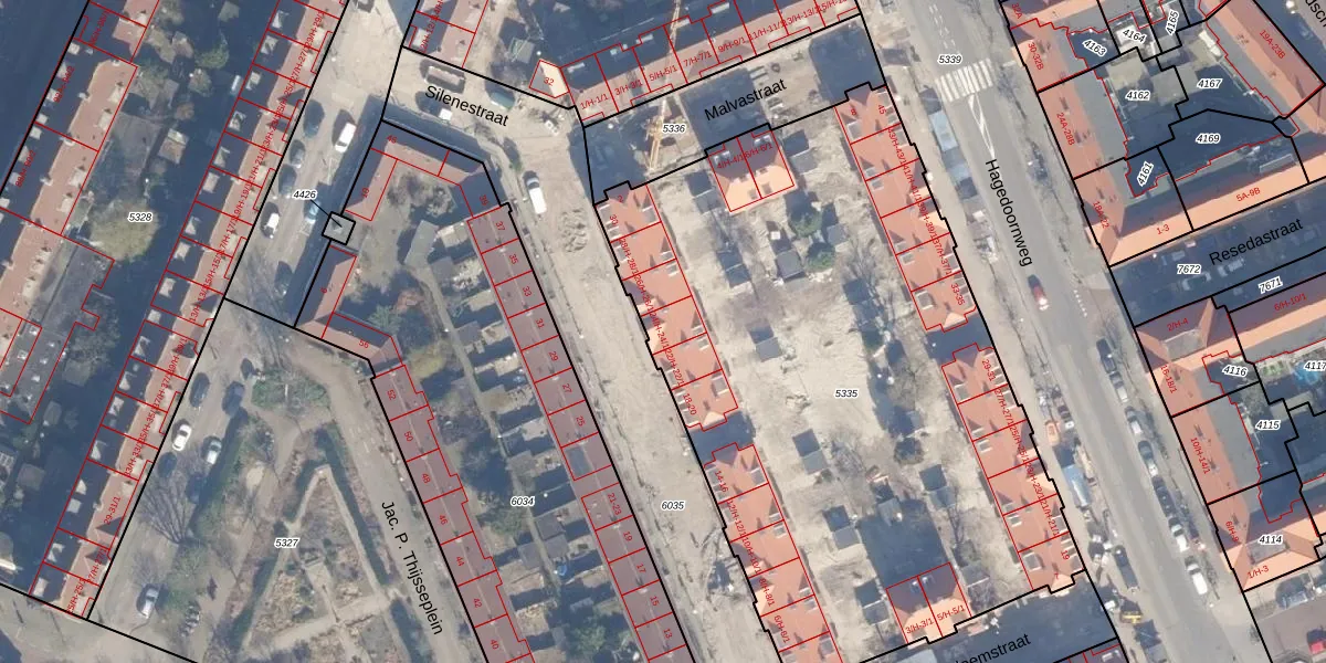 Het perceel waarop Silenestraat 24-H staat heeft een oppervlakte van 3844 m². Dit is een zeer groot perceel. De perceeloppervlakte wordt geregistreerd door het Kadaster. Gedetailleerde informatie over de maten van dit perceel kunt u vinden in het rapport Kadastrale kaart met maatvoering van Silenestraat 24-H.