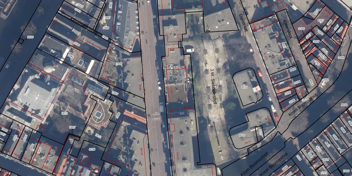 Het perceel waarop Sint Antoniesbreestraat 13-D staat heeft een oppervlakte van 3820 m². Dit is een zeer groot perceel. De perceeloppervlakte wordt geregistreerd door het Kadaster. Gedetailleerde informatie over de maten van dit perceel kunt u vinden in het rapport Kadastrale kaart met maatvoering van Sint Antoniesbreestraat 13-D.
