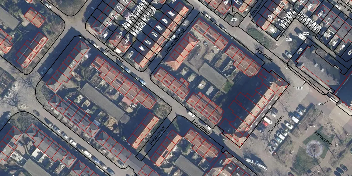 Het perceel waarop Siriusstraat 36 staat heeft een oppervlakte van 3087 m². Dit is een zeer groot perceel. De perceeloppervlakte wordt geregistreerd door het Kadaster. Gedetailleerde informatie over de maten van dit perceel kunt u vinden in het rapport Kadastrale kaart met maatvoering van Siriusstraat 36.