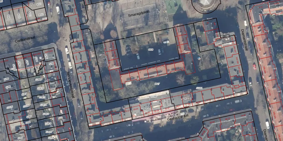 Het perceel waarop Smaragdplein 14-1 staat heeft een oppervlakte van 2278 m². Dit is een zeer groot perceel. De perceeloppervlakte wordt geregistreerd door het Kadaster. Gedetailleerde informatie over de maten van dit perceel kunt u vinden in het rapport Kadastrale kaart met maatvoering van Smaragdplein 14-1.