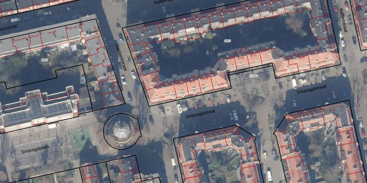Smaragdstraat 23 is gelegen op kadastraal perceel ASD18V6852. Deze kadastrale aanduiding is uniek en wordt gebruikt door het Kadaster om eigendomsrechten en andere zakelijke rechten vast te leggen. Het perceel maakt onderdeel uit van de kadastrale gemeente Amsterdam.