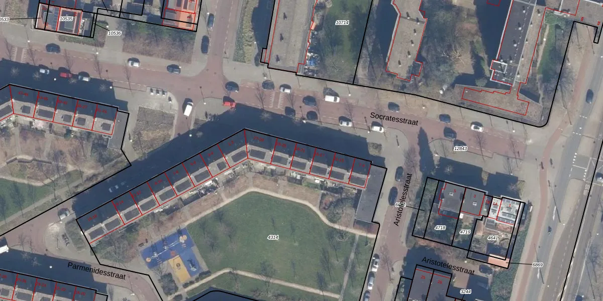 Het perceel waarop Socratesstraat 21 staat heeft een oppervlakte van 4322 m². Dit is een zeer groot perceel. De perceeloppervlakte wordt geregistreerd door het Kadaster. Gedetailleerde informatie over de maten van dit perceel kunt u vinden in het rapport Kadastrale kaart met maatvoering van Socratesstraat 21.