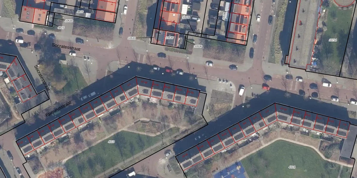 Het perceel waarop Socratesstraat 37 staat heeft een oppervlakte van 4164 m². Dit is een zeer groot perceel. De perceeloppervlakte wordt geregistreerd door het Kadaster. Gedetailleerde informatie over de maten van dit perceel kunt u vinden in het rapport Kadastrale kaart met maatvoering van Socratesstraat 37.