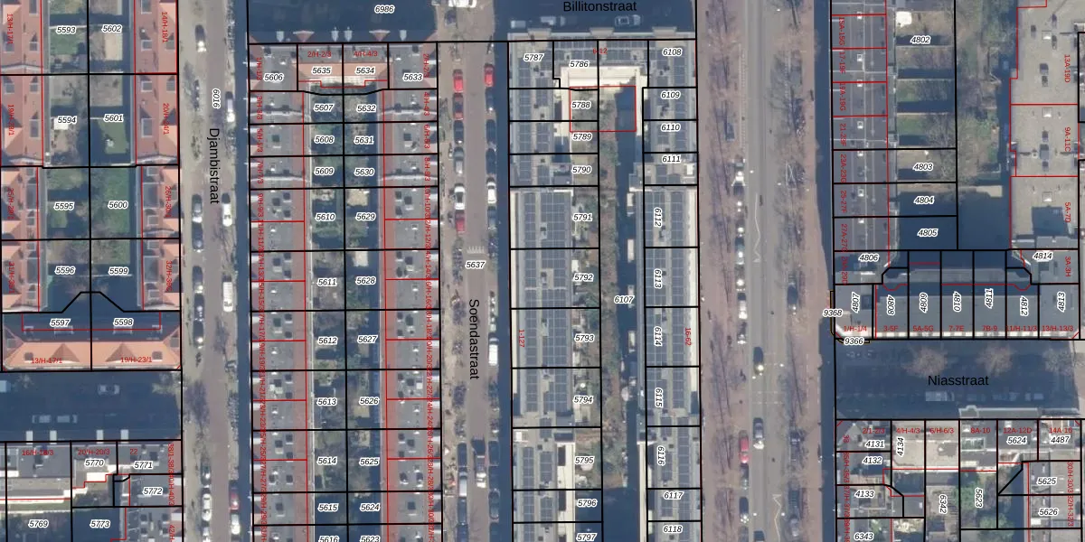 Het perceel waarop Soendastraat 103 staat heeft een oppervlakte van 184 m². Dit is een middelgroot perceel. De perceeloppervlakte wordt geregistreerd door het Kadaster. Gedetailleerde informatie over de maten van dit perceel kunt u vinden in het rapport Kadastrale kaart met maatvoering van Soendastraat 103.
