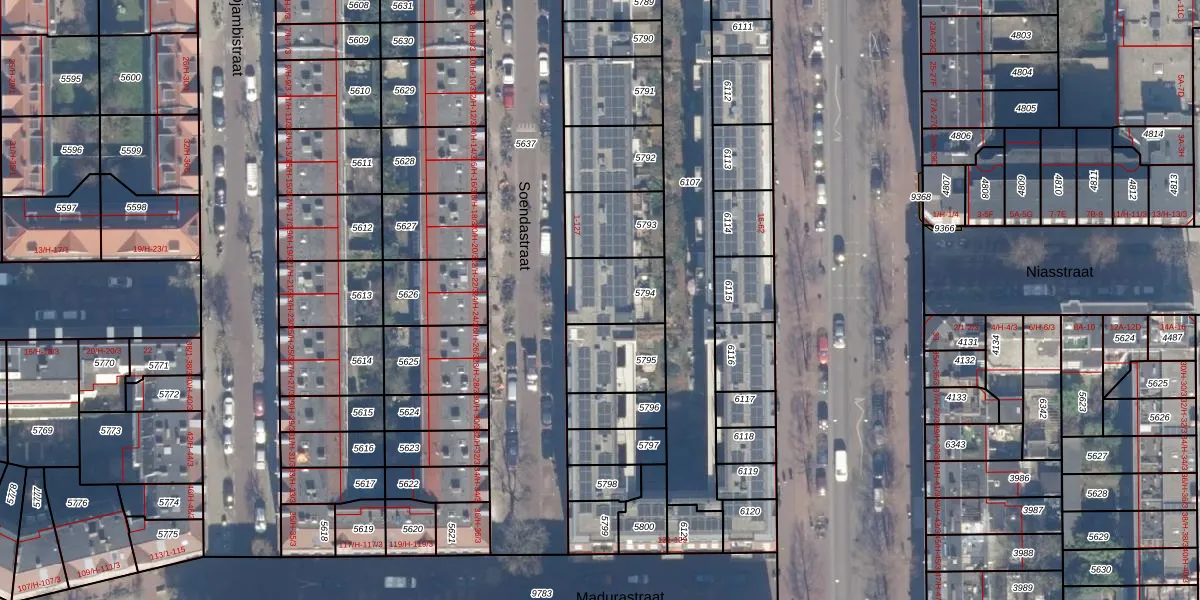 Het perceel waarop Soendastraat 109 staat heeft een oppervlakte van 183 m². Dit is een middelgroot perceel. De perceeloppervlakte wordt geregistreerd door het Kadaster. Gedetailleerde informatie over de maten van dit perceel kunt u vinden in het rapport Kadastrale kaart met maatvoering van Soendastraat 109.