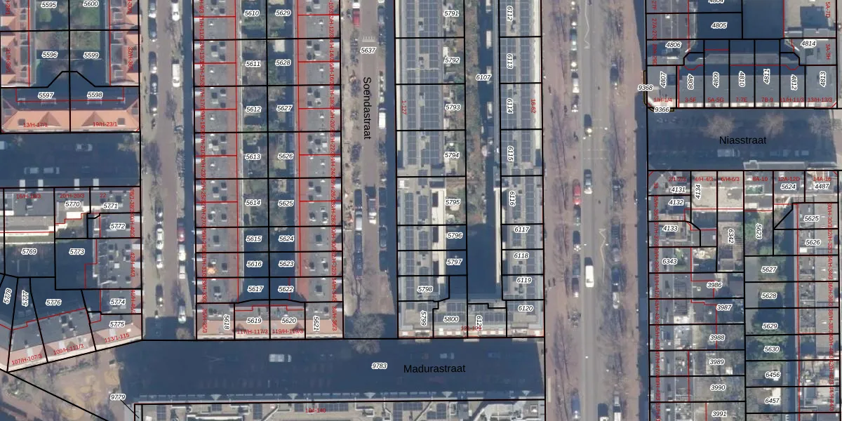 Het perceel waarop Soendastraat 111 staat heeft een oppervlakte van 184 m². Dit is een middelgroot perceel. De perceeloppervlakte wordt geregistreerd door het Kadaster. Gedetailleerde informatie over de maten van dit perceel kunt u vinden in het rapport Kadastrale kaart met maatvoering van Soendastraat 111.