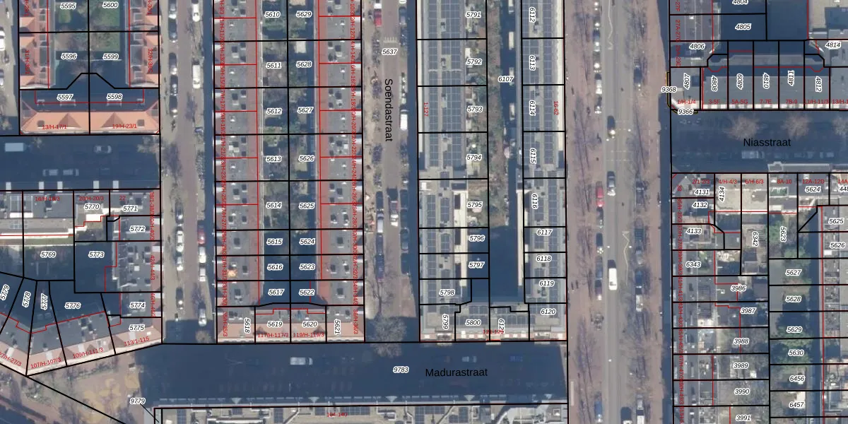 Het perceel waarop Soendastraat 115 staat heeft een oppervlakte van 184 m². Dit is een middelgroot perceel. De perceeloppervlakte wordt geregistreerd door het Kadaster. Gedetailleerde informatie over de maten van dit perceel kunt u vinden in het rapport Kadastrale kaart met maatvoering van Soendastraat 115.