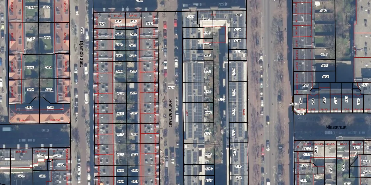 Het perceel waarop Soendastraat 59 staat heeft een oppervlakte van 184 m². Dit is een middelgroot perceel. De perceeloppervlakte wordt geregistreerd door het Kadaster. Gedetailleerde informatie over de maten van dit perceel kunt u vinden in het rapport Kadastrale kaart met maatvoering van Soendastraat 59.
