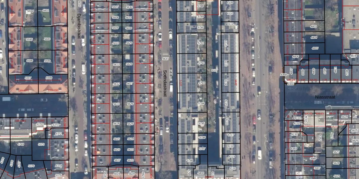 Het perceel waarop Soendastraat 65 staat heeft een oppervlakte van 184 m². Dit is een middelgroot perceel. De perceeloppervlakte wordt geregistreerd door het Kadaster. Gedetailleerde informatie over de maten van dit perceel kunt u vinden in het rapport Kadastrale kaart met maatvoering van Soendastraat 65.