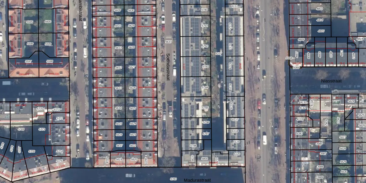 Het perceel waarop Soendastraat 71 staat heeft een oppervlakte van 183 m². Dit is een middelgroot perceel. De perceeloppervlakte wordt geregistreerd door het Kadaster. Gedetailleerde informatie over de maten van dit perceel kunt u vinden in het rapport Kadastrale kaart met maatvoering van Soendastraat 71.