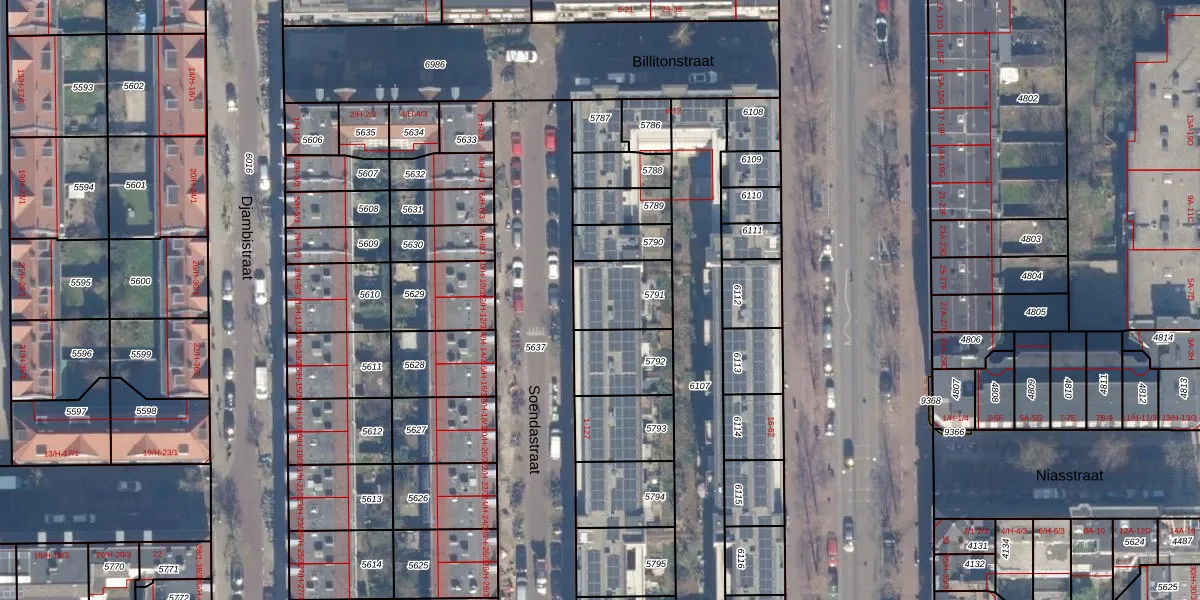Het perceel waarop Soendastraat 73 staat heeft een oppervlakte van 184 m². Dit is een middelgroot perceel. De perceeloppervlakte wordt geregistreerd door het Kadaster. Gedetailleerde informatie over de maten van dit perceel kunt u vinden in het rapport Kadastrale kaart met maatvoering van Soendastraat 73.