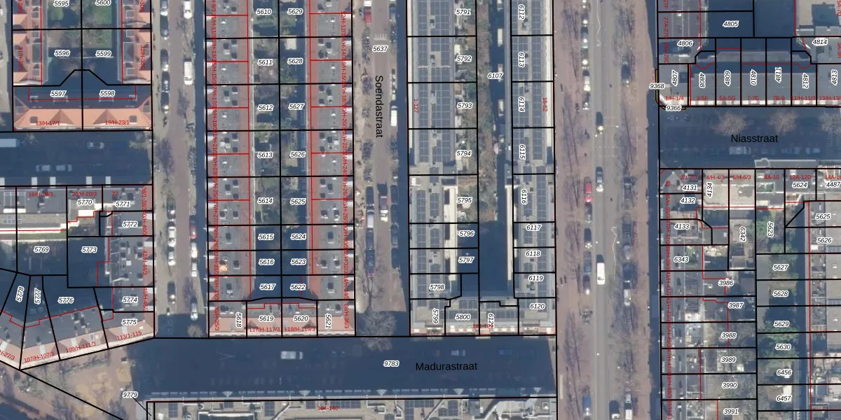Het perceel waarop Soendastraat 83 staat heeft een oppervlakte van 184 m². Dit is een middelgroot perceel. De perceeloppervlakte wordt geregistreerd door het Kadaster. Gedetailleerde informatie over de maten van dit perceel kunt u vinden in het rapport Kadastrale kaart met maatvoering van Soendastraat 83.