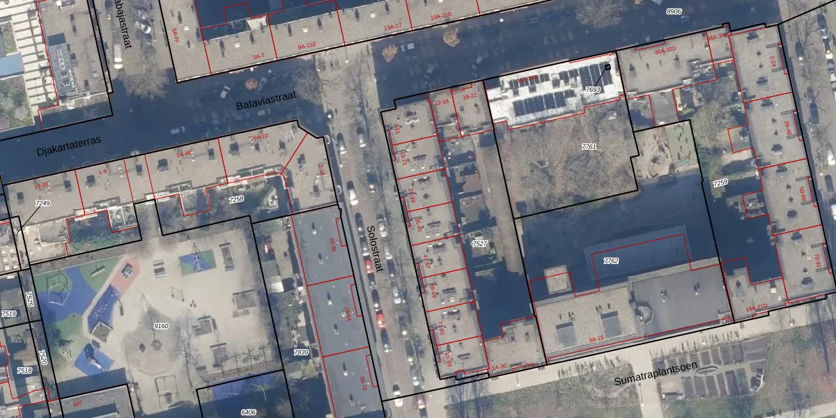 Het perceel waarop Solostraat 27 staat heeft een oppervlakte van 1757 m². Dit is een zeer groot perceel. De perceeloppervlakte wordt geregistreerd door het Kadaster. Gedetailleerde informatie over de maten van dit perceel kunt u vinden in het rapport Kadastrale kaart met maatvoering van Solostraat 27.