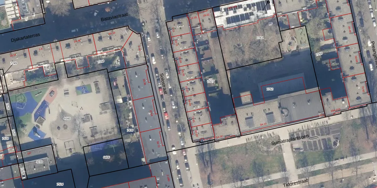 Het perceel waarop Solostraat 49 staat heeft een oppervlakte van 1757 m². Dit is een zeer groot perceel. De perceeloppervlakte wordt geregistreerd door het Kadaster. Gedetailleerde informatie over de maten van dit perceel kunt u vinden in het rapport Kadastrale kaart met maatvoering van Solostraat 49.