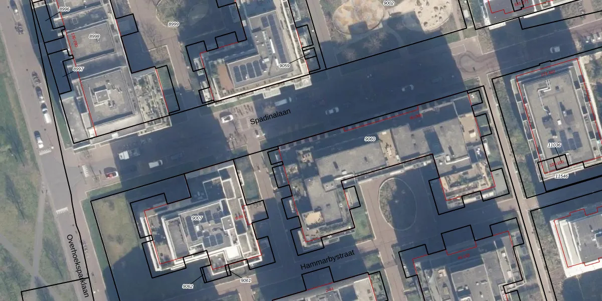 Spadinalaan 96 is gelegen op kadastraal perceel ASD07K9060. Deze kadastrale aanduiding is uniek en wordt gebruikt door het Kadaster om eigendomsrechten en andere zakelijke rechten vast te leggen. Het perceel maakt onderdeel uit van de kadastrale gemeente Amsterdam.