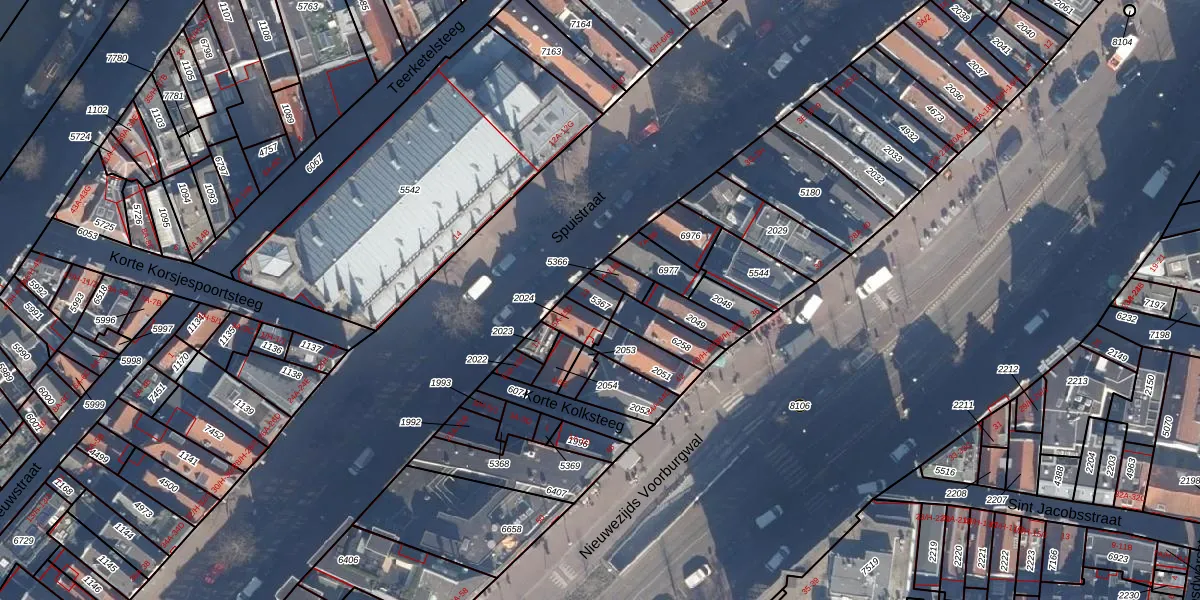 Het perceel waarop Spuistraat 13-A staat heeft een oppervlakte van 47 m². Dit is een klein perceel. De perceeloppervlakte wordt geregistreerd door het Kadaster. Gedetailleerde informatie over de maten van dit perceel kunt u vinden in het rapport Kadastrale kaart met maatvoering van Spuistraat 13-A.