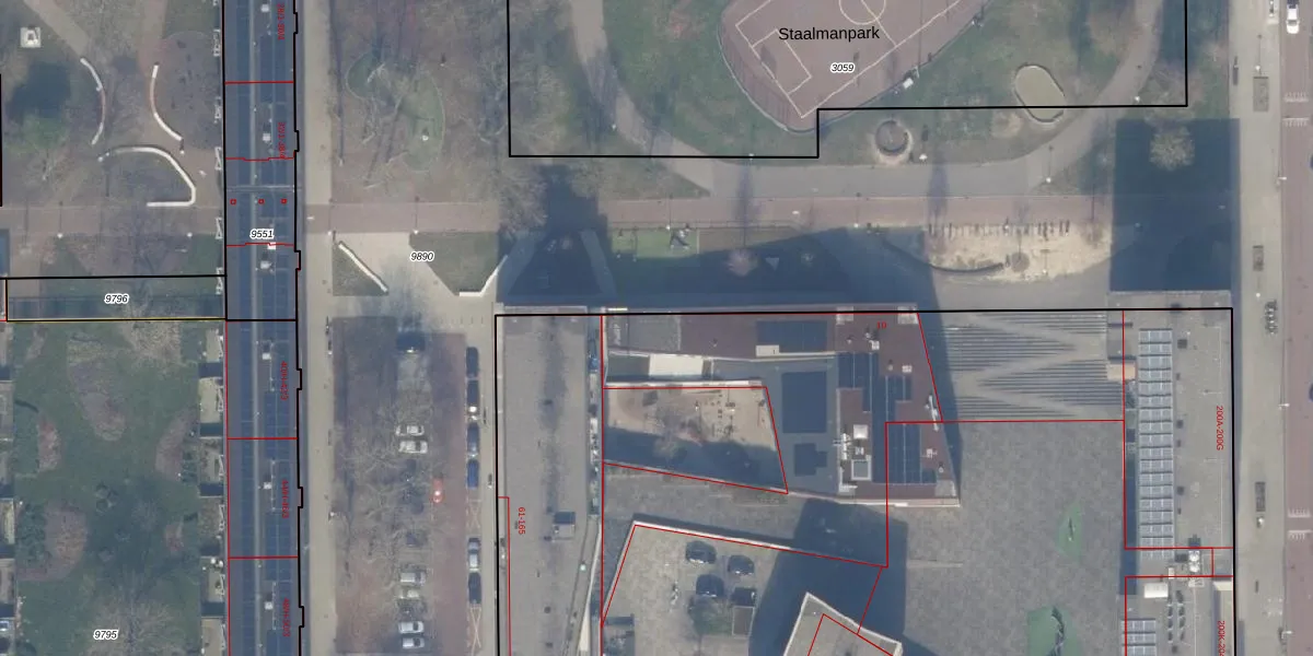 Het perceel waarop Staalmanpark 12 staat heeft een oppervlakte van 1,1 ha. Dit is een zeer groot perceel. De perceeloppervlakte wordt geregistreerd door het Kadaster. Gedetailleerde informatie over de maten van dit perceel kunt u vinden in het rapport Kadastrale kaart met maatvoering van Staalmanpark 12.