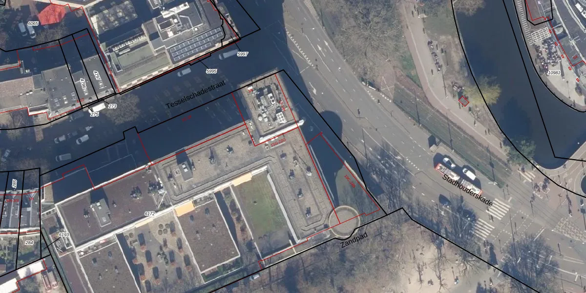 Het perceel waarop Stadhouderskade 18-A staat heeft een oppervlakte van 6288 m². Dit is een zeer groot perceel. De perceeloppervlakte wordt geregistreerd door het Kadaster. Gedetailleerde informatie over de maten van dit perceel kunt u vinden in het rapport Kadastrale kaart met maatvoering van Stadhouderskade 18-A.