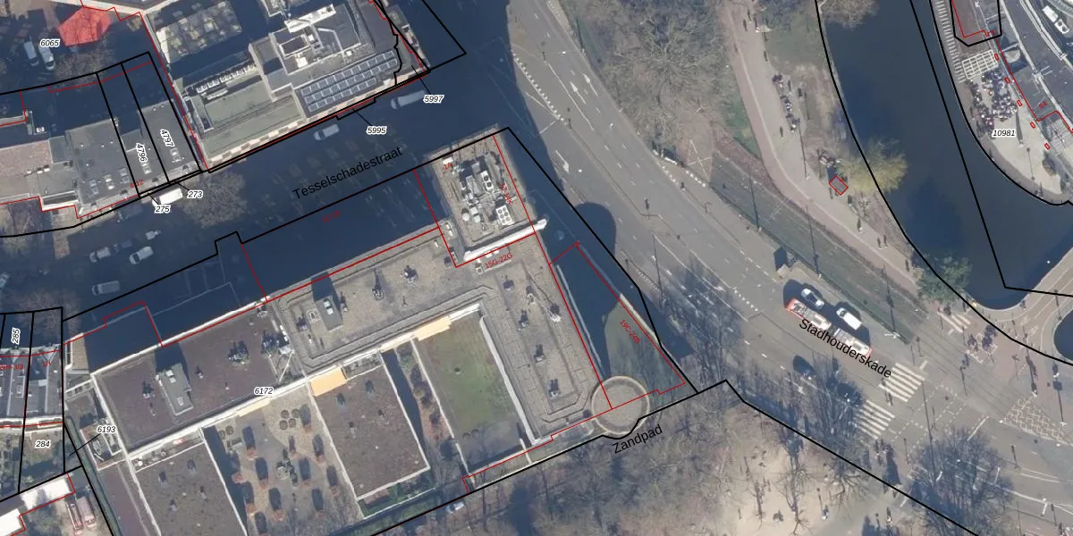 Het perceel waarop Stadhouderskade 18-B staat heeft een oppervlakte van 6288 m². Dit is een zeer groot perceel. De perceeloppervlakte wordt geregistreerd door het Kadaster. Gedetailleerde informatie over de maten van dit perceel kunt u vinden in het rapport Kadastrale kaart met maatvoering van Stadhouderskade 18-B.