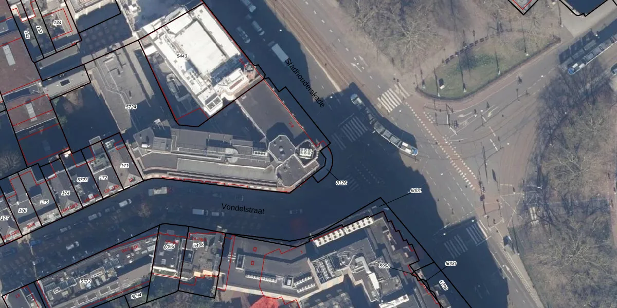 Het perceel waarop Stadhouderskade 8 staat heeft een oppervlakte van 2265 m². Dit is een zeer groot perceel. De perceeloppervlakte wordt geregistreerd door het Kadaster. Gedetailleerde informatie over de maten van dit perceel kunt u vinden in het rapport Kadastrale kaart met maatvoering van Stadhouderskade 8.