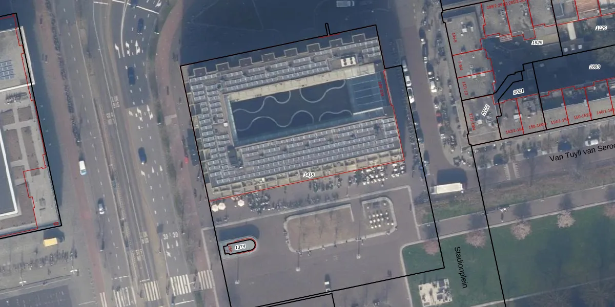 Het perceel waarop Stadionplein 138 staat heeft een oppervlakte van 5670 m². Dit is een zeer groot perceel. De perceeloppervlakte wordt geregistreerd door het Kadaster. Gedetailleerde informatie over de maten van dit perceel kunt u vinden in het rapport Kadastrale kaart met maatvoering van Stadionplein 138.