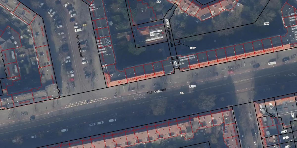 Het perceel waarop Stadionweg 282-3 staat heeft een oppervlakte van 4961 m². Dit is een zeer groot perceel. De perceeloppervlakte wordt geregistreerd door het Kadaster. Gedetailleerde informatie over de maten van dit perceel kunt u vinden in het rapport Kadastrale kaart met maatvoering van Stadionweg 282-3.
