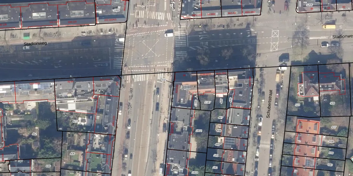 Het perceel waarop Stadionweg 39 staat heeft een oppervlakte van 303 m². Dit is een groot perceel. De perceeloppervlakte wordt geregistreerd door het Kadaster. Gedetailleerde informatie over de maten van dit perceel kunt u vinden in het rapport Kadastrale kaart met maatvoering van Stadionweg 39.