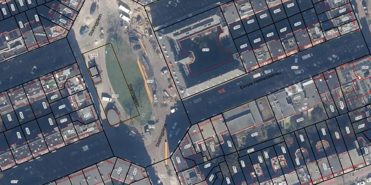 Het perceel waarop Staringplein 9-A-16 staat heeft een oppervlakte van 1497 m². Dit is een zeer groot perceel. De perceeloppervlakte wordt geregistreerd door het Kadaster. Gedetailleerde informatie over de maten van dit perceel kunt u vinden in het rapport Kadastrale kaart met maatvoering van Staringplein 9-A-16.