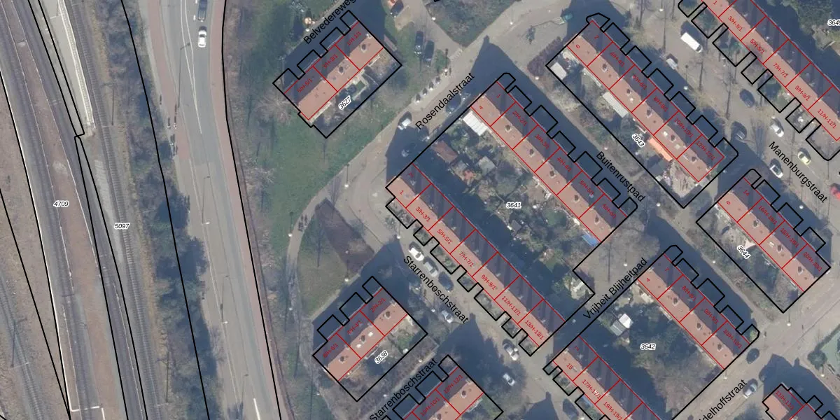 Het perceel waarop Starrenboschstraat 3-H staat heeft een oppervlakte van 1998 m². Dit is een zeer groot perceel. De perceeloppervlakte wordt geregistreerd door het Kadaster. Gedetailleerde informatie over de maten van dit perceel kunt u vinden in het rapport Kadastrale kaart met maatvoering van Starrenboschstraat 3-H.