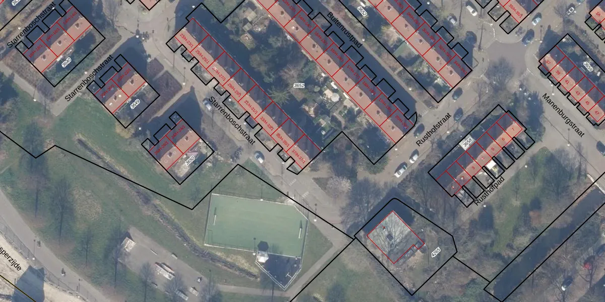 Het perceel waarop Starrenboschstraat 37-1 staat heeft een oppervlakte van 2694 m². Dit is een zeer groot perceel. De perceeloppervlakte wordt geregistreerd door het Kadaster. Gedetailleerde informatie over de maten van dit perceel kunt u vinden in het rapport Kadastrale kaart met maatvoering van Starrenboschstraat 37-1.