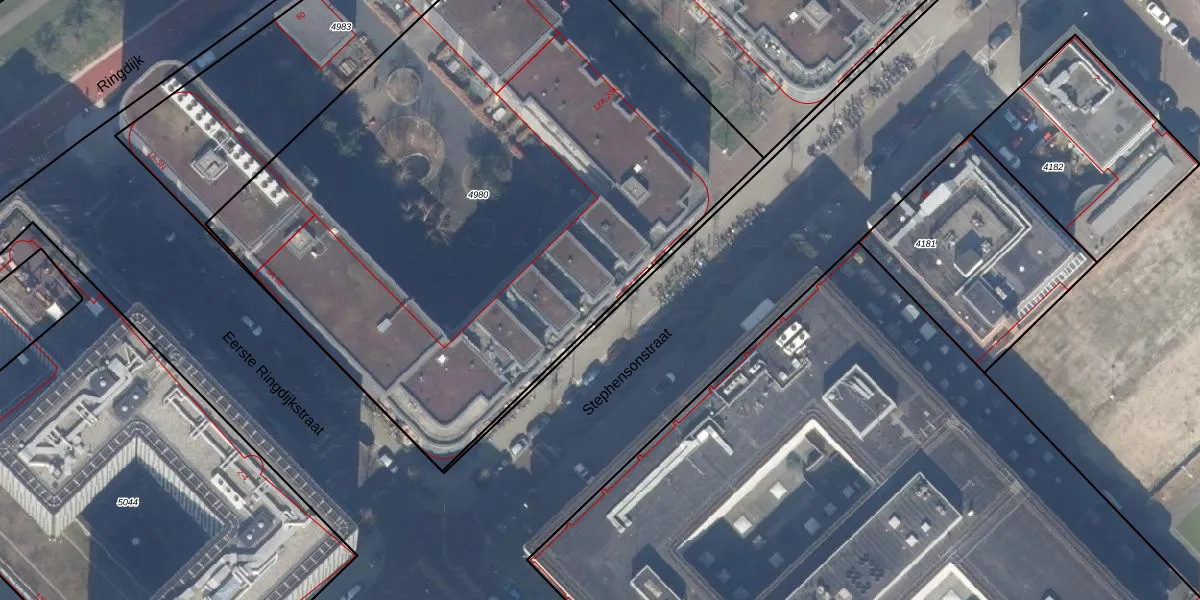 Het perceel waarop Stephensonstraat 16-C staat heeft een oppervlakte van 4235 m². Dit is een zeer groot perceel. De perceeloppervlakte wordt geregistreerd door het Kadaster. Gedetailleerde informatie over de maten van dit perceel kunt u vinden in het rapport Kadastrale kaart met maatvoering van Stephensonstraat 16-C.