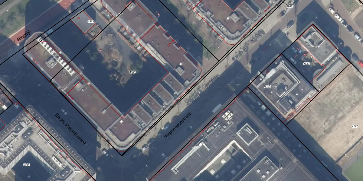Het perceel waarop Stephensonstraat 16-G staat heeft een oppervlakte van 4235 m². Dit is een zeer groot perceel. De perceeloppervlakte wordt geregistreerd door het Kadaster. Gedetailleerde informatie over de maten van dit perceel kunt u vinden in het rapport Kadastrale kaart met maatvoering van Stephensonstraat 16-G.