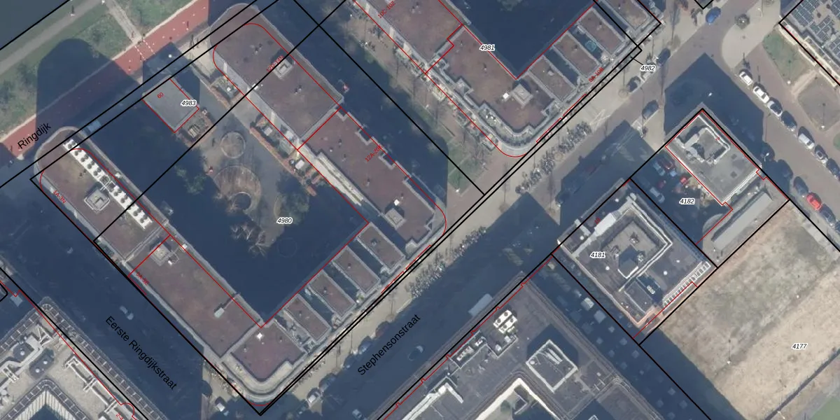 Het perceel waarop Stephensonstraat 18-W staat heeft een oppervlakte van 4235 m². Dit is een zeer groot perceel. De perceeloppervlakte wordt geregistreerd door het Kadaster. Gedetailleerde informatie over de maten van dit perceel kunt u vinden in het rapport Kadastrale kaart met maatvoering van Stephensonstraat 18-W.