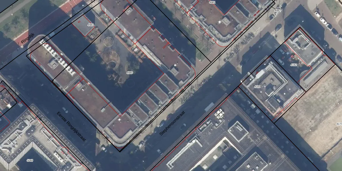 Het perceel waarop Stephensonstraat 18-P staat heeft een oppervlakte van 4235 m². Dit is een zeer groot perceel. De perceeloppervlakte wordt geregistreerd door het Kadaster. Gedetailleerde informatie over de maten van dit perceel kunt u vinden in het rapport Kadastrale kaart met maatvoering van Stephensonstraat 18-P.