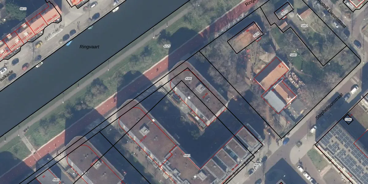 Het perceel waarop Stephensonstraat 4-G staat heeft een oppervlakte van 2885 m². Dit is een zeer groot perceel. De perceeloppervlakte wordt geregistreerd door het Kadaster. Gedetailleerde informatie over de maten van dit perceel kunt u vinden in het rapport Kadastrale kaart met maatvoering van Stephensonstraat 4-G.