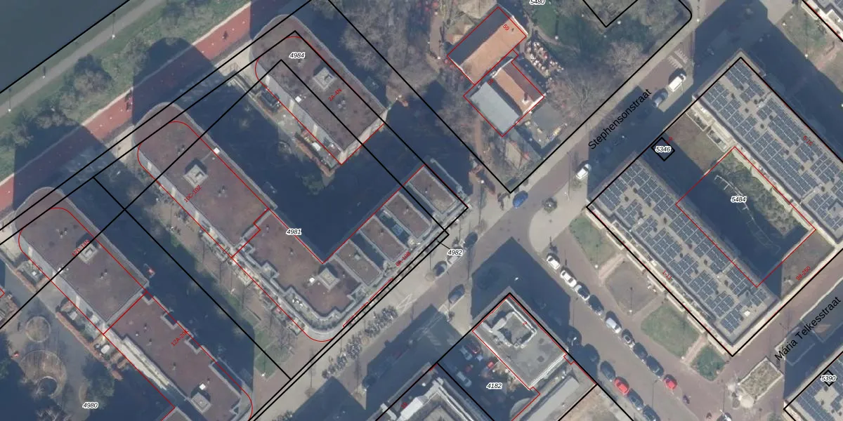 Het perceel waarop Stephensonstraat 6-L staat heeft een oppervlakte van 2885 m². Dit is een zeer groot perceel. De perceeloppervlakte wordt geregistreerd door het Kadaster. Gedetailleerde informatie over de maten van dit perceel kunt u vinden in het rapport Kadastrale kaart met maatvoering van Stephensonstraat 6-L.
