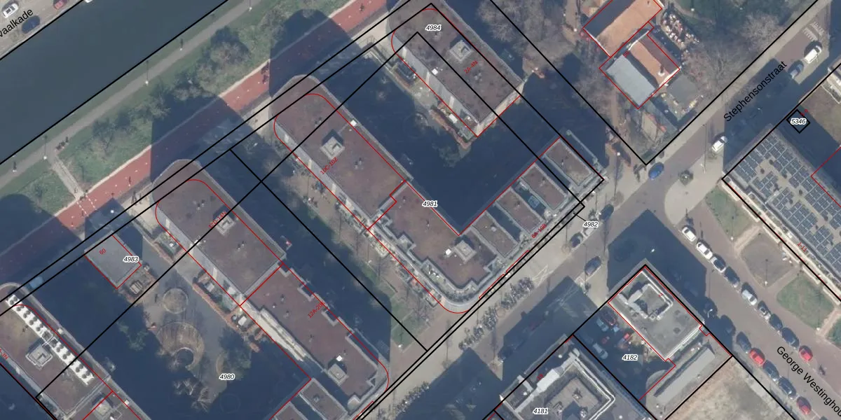 Het perceel waarop Stephensonstraat 8-S staat heeft een oppervlakte van 2885 m². Dit is een zeer groot perceel. De perceeloppervlakte wordt geregistreerd door het Kadaster. Gedetailleerde informatie over de maten van dit perceel kunt u vinden in het rapport Kadastrale kaart met maatvoering van Stephensonstraat 8-S.